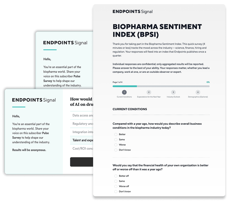 1,000+ qualified respondents per survey Long-form surveys used for quarterly and annual reports measuring the state of the industry and sentiment among leaders. Includes the Biopharma Sentiment Index (BPSI), the Innovation Index and E100.
